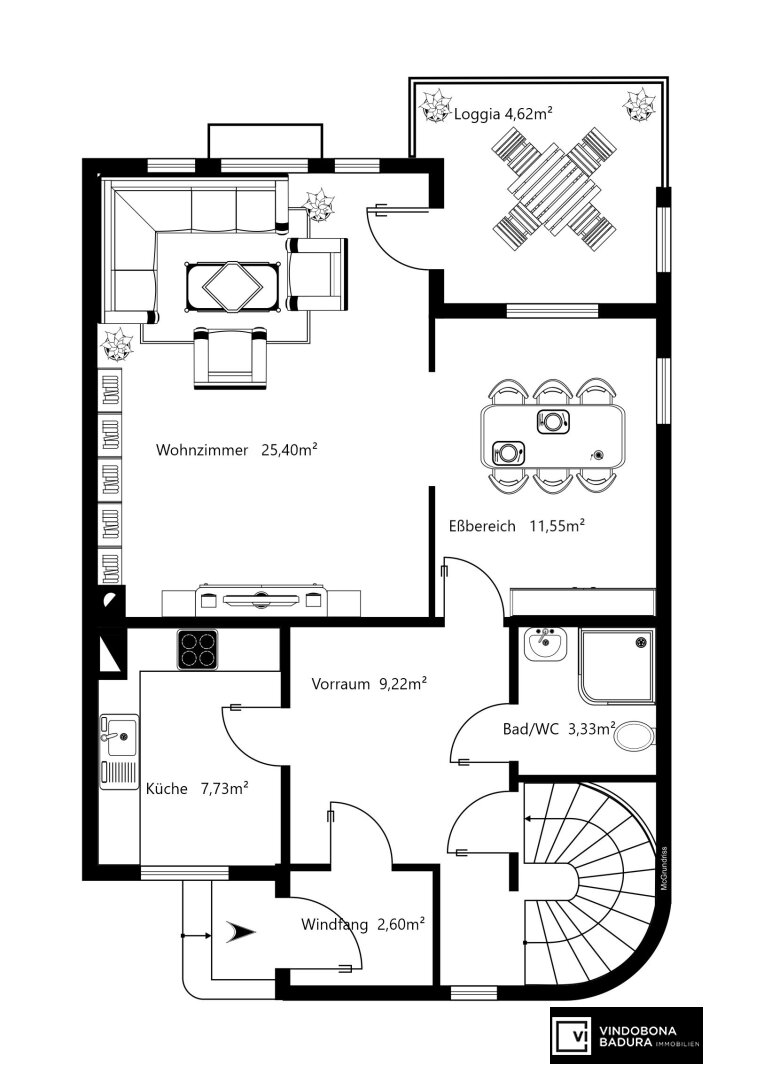 Erdgeschoss: Großzügiges Wohnzimmer mit Zugang zur Loggia und dem eigenen Garten, Essbereich, Küche, Dusche mit WC, Vorraum und Treppenaufgang