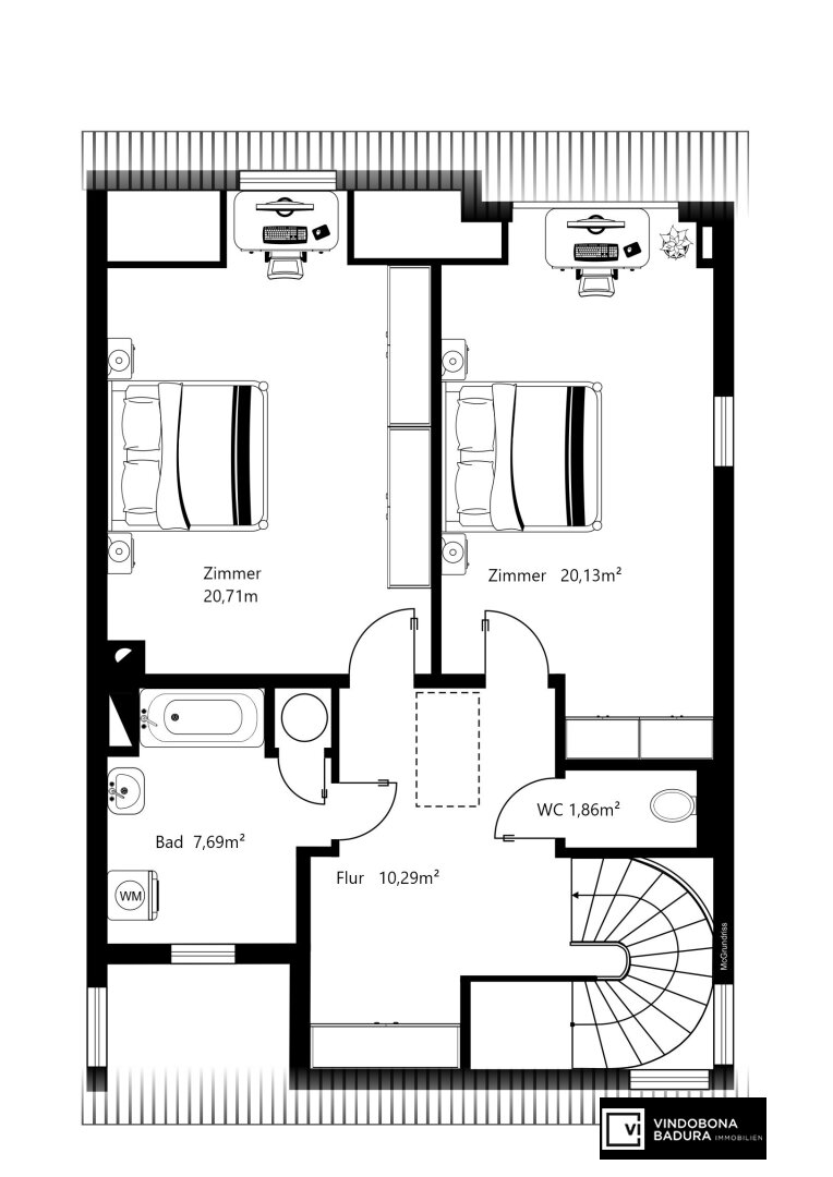 1. Obergeschoss: Zwei Schlafzimmer, großes Badezimmer mit Wanne, Abstellraum