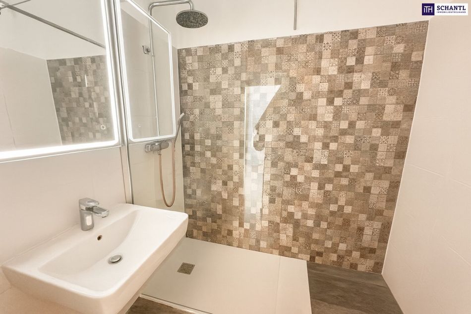 Modern ausgestattet mit ebenerdiger Dusche, hochwertigen Fliesen und elegantem Waschtisch.