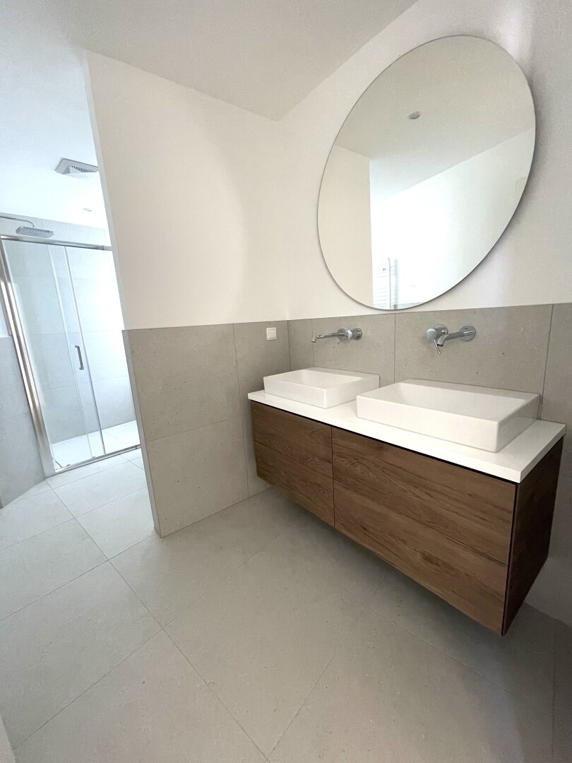 Das großzügige Badezimmer mit Doppelwaschbecken, Dusche und Toilette grenzt direkt an den großen Schlafraum an. Eine separate Toilette vom Gang aus begehbar bietet zusätzliche Privatsphäre. Doppel- bzw. Mehrfachverglasung sorgt für eine ruhige Atmosphäre.
