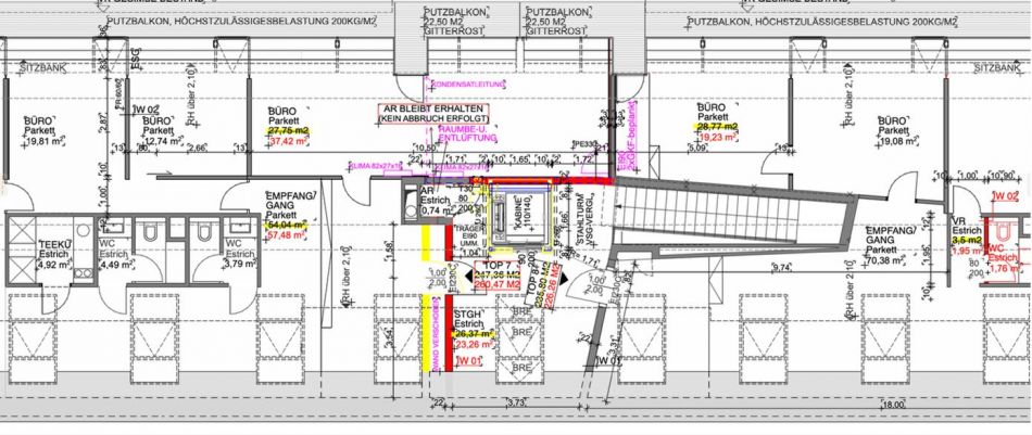 Sie betreten das Büro und gelangen direkt in den einladenden Empfangsbereich, welcher zu den Büro- bzw. Besprechungsräumen führt. Der Empfang bietet Platz für diverse Sitzmöglichkeiten, um Ihren Gästen ein angenehmes Verweilen zu ermöglichen. Insgesamt stehen Ihnen 5 Büroräume mit Nutzflächen von ca. 18 m² bis ca. 70 m² zur Verfügung, welche durch die großen Fensterfronten mit viel Tageslicht versorgt werden und somit optimale Arbeitsbedingungen bieten. Vom Eingang aus linkerhand finden Sie einen ca. 18 m² großen Büroraum vor, welcher zudem über einen Balkon verfügt. Alle Büroräume erreichen Sie zentral vom Empfang bzw. Wartebereich aus. Gegenüber dem Wartebereich finden Sie zudem eine Teeküche, ein Bad mit Dusche und WC sowie einen Abstellraum vor. Beheizt wird die Immobilie mittels Gas-Zentralheizung. Für Abkühlung im Sommer sorgt eine Klimaanlage.