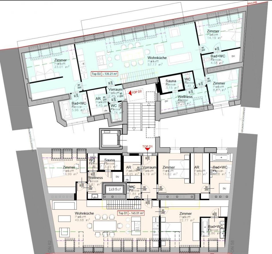 - Top D2: 4-Zimmer Wohnung mit ca. 135,21 m² und ca. 71,95 m² Terrasse.