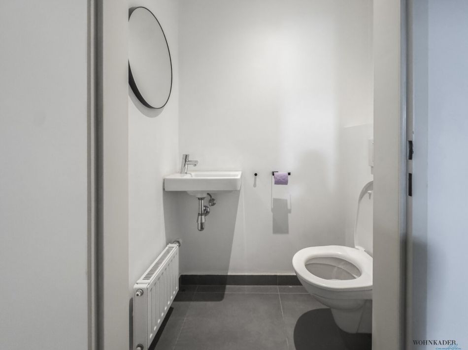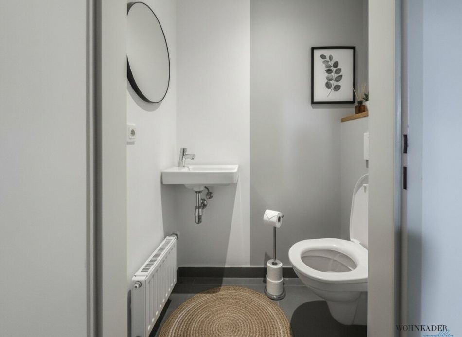 Die neuwertige Küche ist vollständig ausgestattet und bietet alles, was man im Alltag benötigt. Das Badezimmer verfügt über eine Dusche, ein Waschbecken und eine Waschmaschine, während das separate WC zusätzlich mit einem Handwaschbecken ausgestattet ist. Ein praktischer Abstellraum sorgt für zusätzlichen Stauraum und Ordnung.