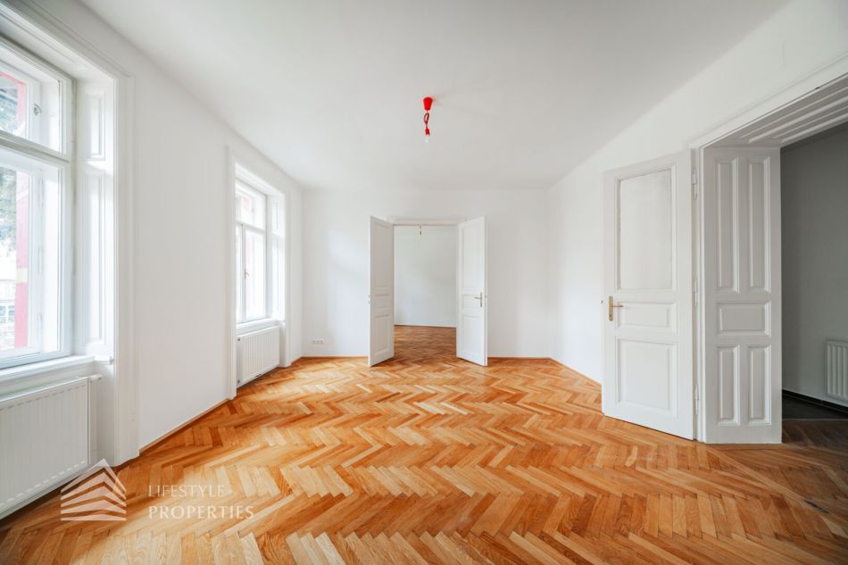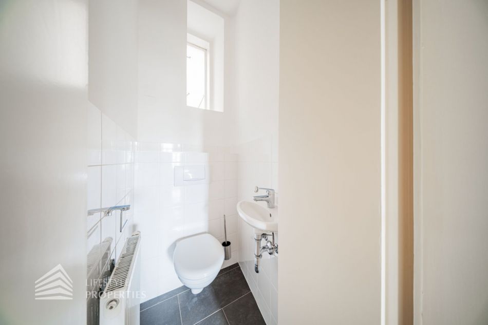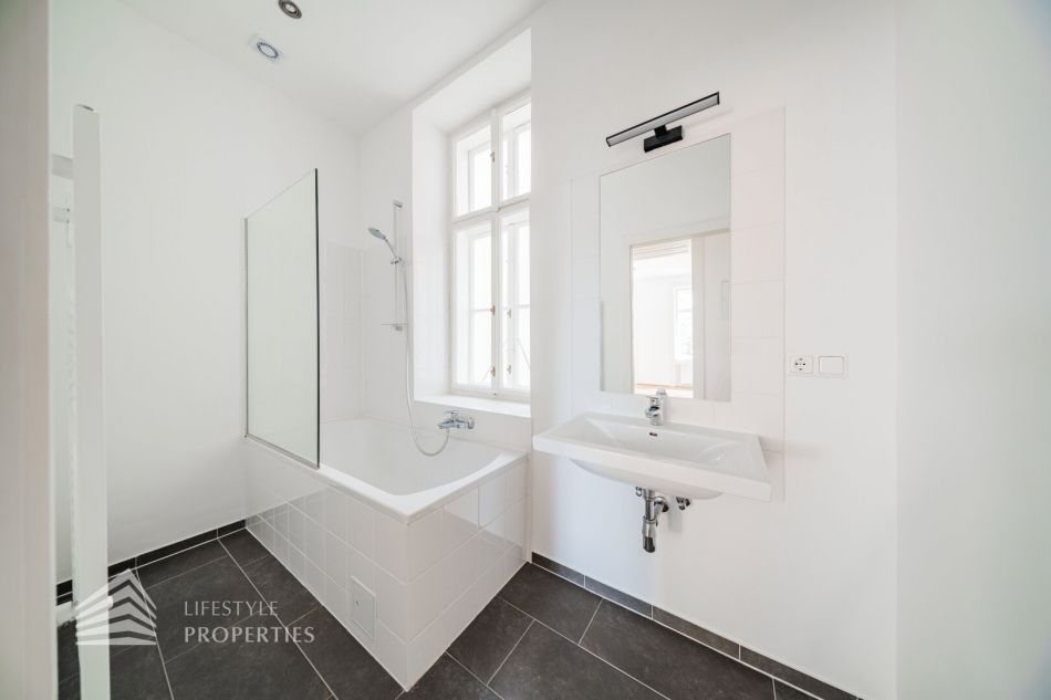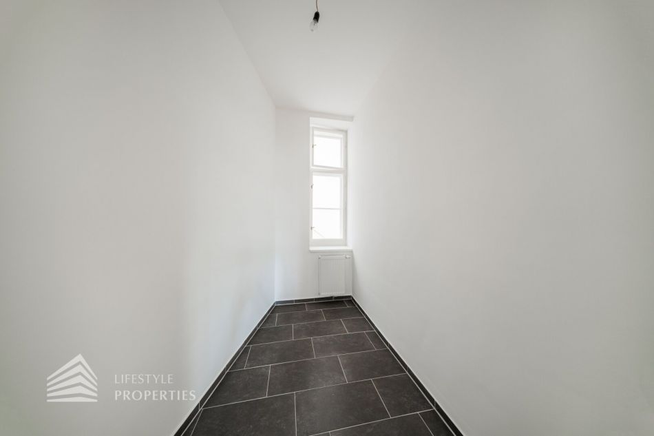 Sie betreten die Wohnung und befinden sich im etwa 13 m² großen Vorraum. Gleich rechts vom Eingang befindet sich das WC. Dahinter liegt das Badezimmer, ausgestattet mit einer Badewanne, einem Waschbecken und einem Fenster. Linkerhand vom Vorraum betritt man das ca. 21 m² große Wohnzimmer, mit zwei separaten Zugängen zu den Schlafzimmern. Von einem der Schlafzimmer hat man außerdem Zugang zu einem Kabinett (sehr gut als begehbarer Kleiderschrank nutzbar) mit einer Fläche von ca. 5 m². Zurück im Vorraum gelangen Sie geradewegs in die praktische Küche, die bereits mit einer eingebauten Küchenzeile ausgestattet ist.