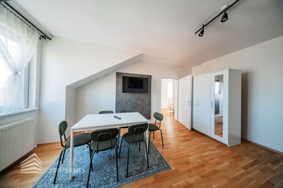 Die Wohnung befindet sich im DG eines schönen Stilaltbaus aus dem Jahr 1897 und gliedert sich in einen Vorraum, einen Wohnraum, ein Zimmer, eine Küche, ein Badezimmer und ein separates WC. Die Wohnung ist möbliert.
