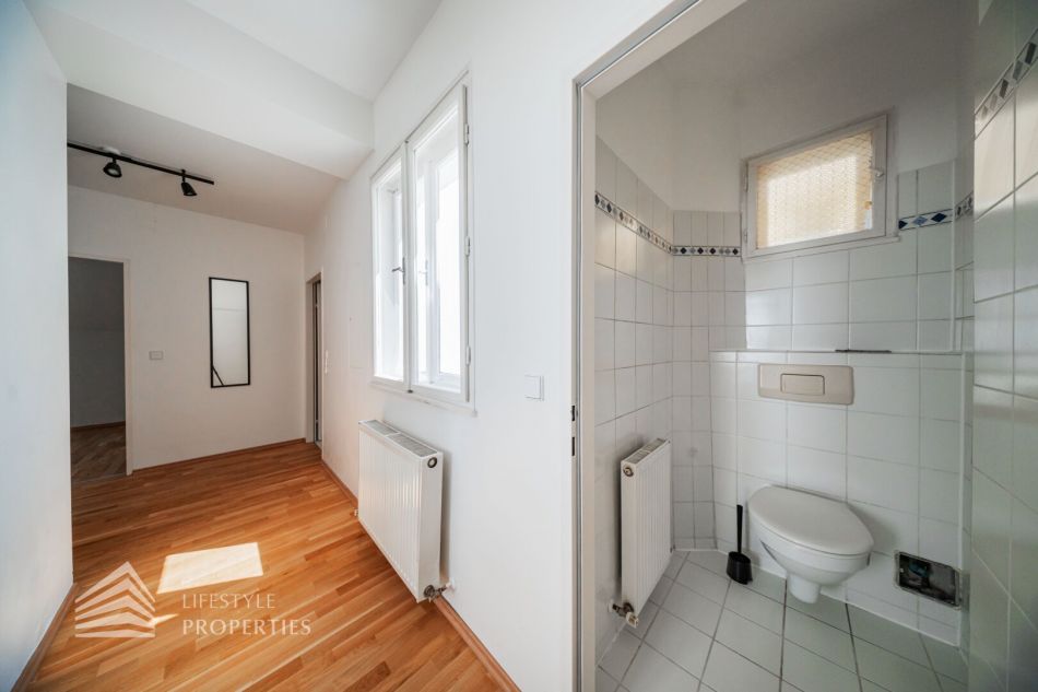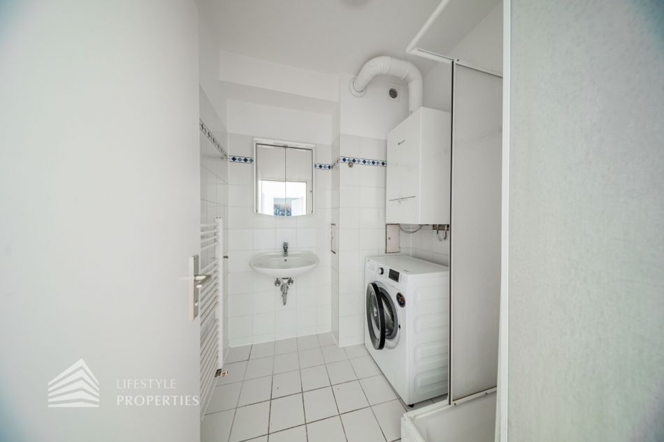Sie betreten die Wohnung und befinden sich im Vorraum, sowohl das Wohnzimmer als auch das Schlafzimmer sind zentral vom Vorraum begehbar. Das Bad ist mit einer Dusche, einem Handwaschbecken und einem Handtuchtrockner ausgestattet. Die Küche befindet sich links beim Wohnungseingang. Das separate WC ist ebenfalls vom Vorraum erreichbar. Die Wohnräume sind mit schönem Parkett ausgestattet und die Nassräume sind verfliest.
