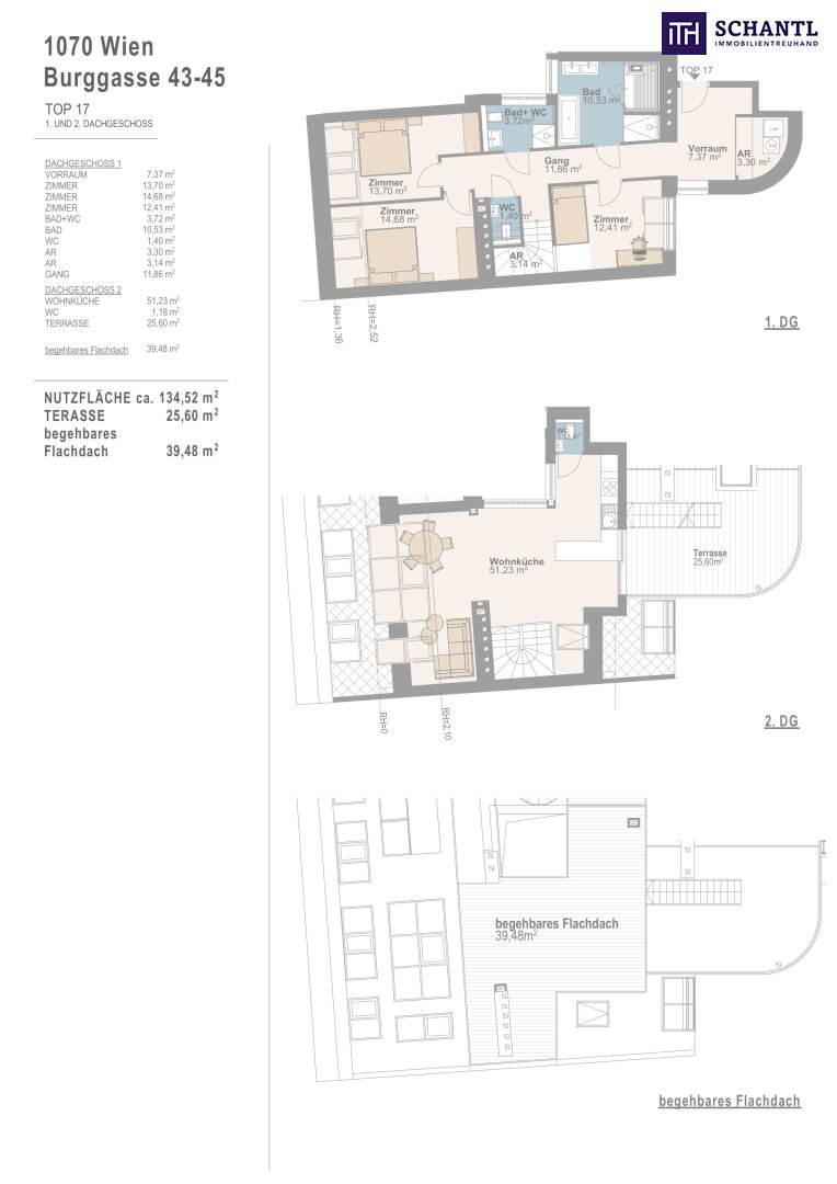 Wohnfläche: ca. 134,52m² + Terrasse (2.Ebene): ca. 25,60m² + Begehbares Flachdach: ca. 39,48m²