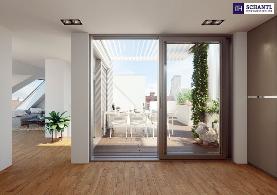 Der Sonne entgegen erreichen Sie dann über eine stylische Holztreppe die 2.Ebene auf welcher sich ein weiteres WC sowie ein supergroßer Wohn-Essbereich mit Zugang zur hofseitigen Traumterrasse, befindet. Ihre knapp 26m² große Terrasse ist in den Sonnenmonaten sicherlich eine gelungene Vergrößerung des Wohnbereichs. Ein weiteres Highlight ist das atemberaubende, begehbare Flachdach mit Blick über Wien! Genießen Sie die Sonnenaufgänge und Sonnenuntergänge, die grandiosen Silvester-Feuerwerke oder einfach nur das neue Lebensgefühl!