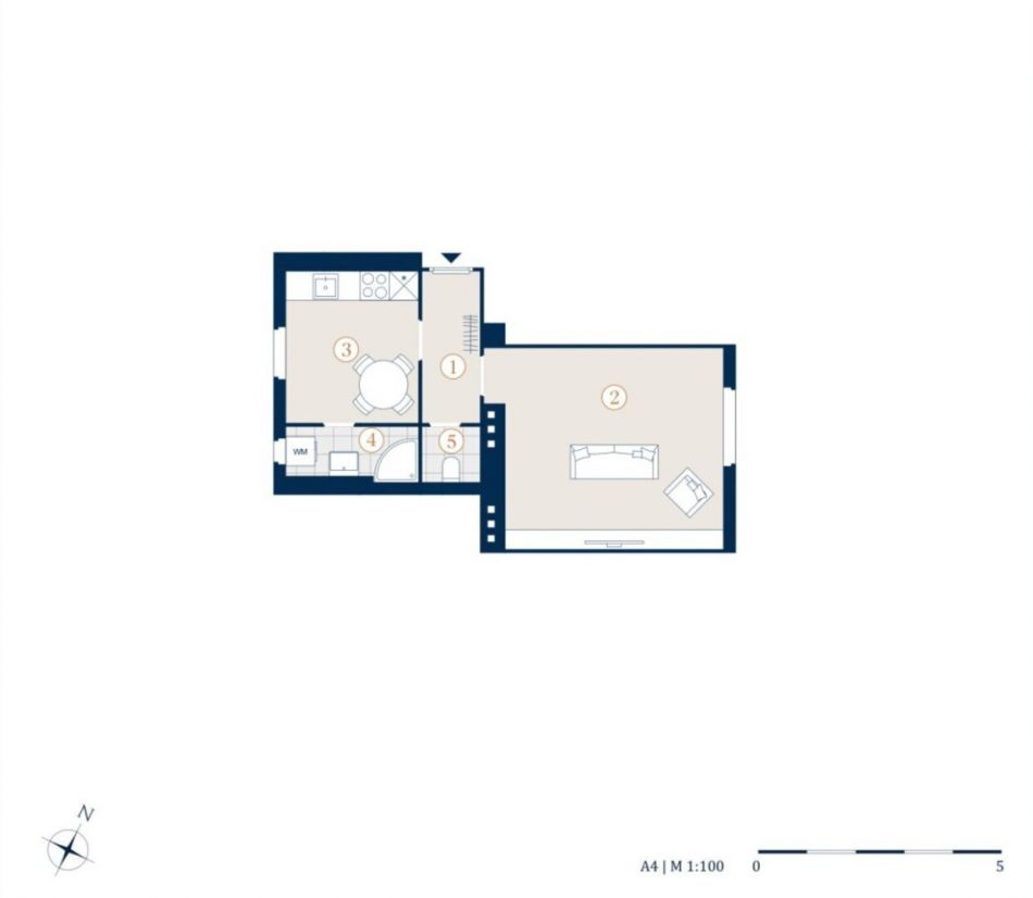 Die Wohnung gliedert sich in einen Vorraum, einen Wohn- Schlafraum, eine Küche, ein Badezimmer und ein separates WC.