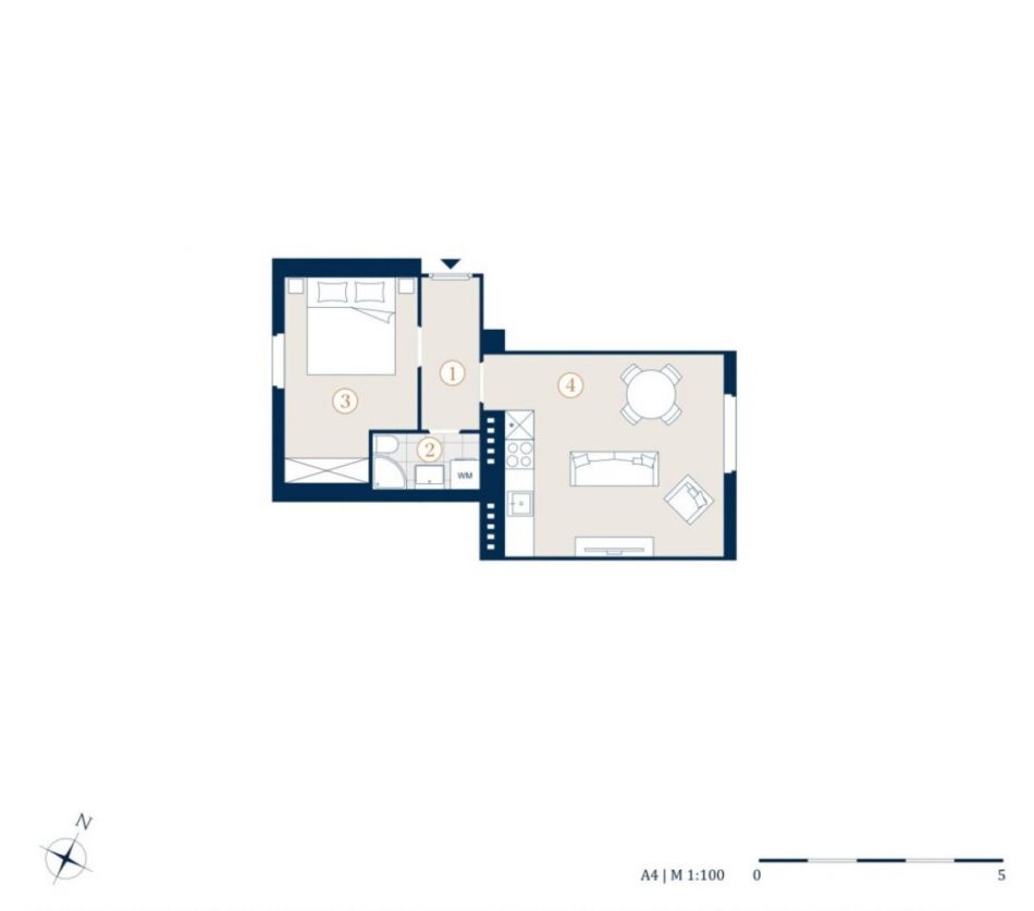 Die Wohnung gliedert sich in einen Vorraum, eine Wohnküche, ein Schlafzimmer, ein Badezimmer und ein separates WC.