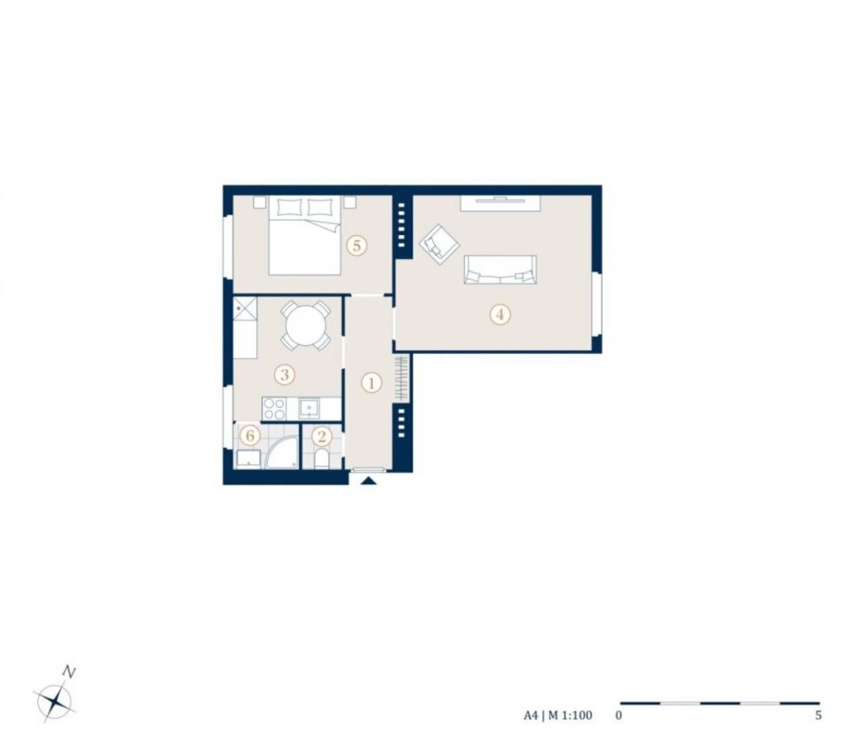Sie betreten die Wohnung und befinden sich im Vorraum. Gerade durch gelangen Sie in das Schlafzimmer. Rechterhand befindet sich das Wohnzimmer. Die Küche ist voll ausgestattet und bietet Platz für einen Tisch. Das Bad ist mit einer Dusche und einem Waschbecken ausgestattet. Das separate WC ist auch vom Vorraum erreichbar.