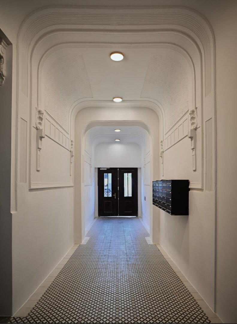 Die Wände sind weiß, mit Dispersion beschichtet. In den Wohnräumen wird neuer Altwiener Eichen-Fischgrät-Parkett verlegt. Sanitärräume werden mit Feinsteinzeug italienischer Herstellung ausgelegt.