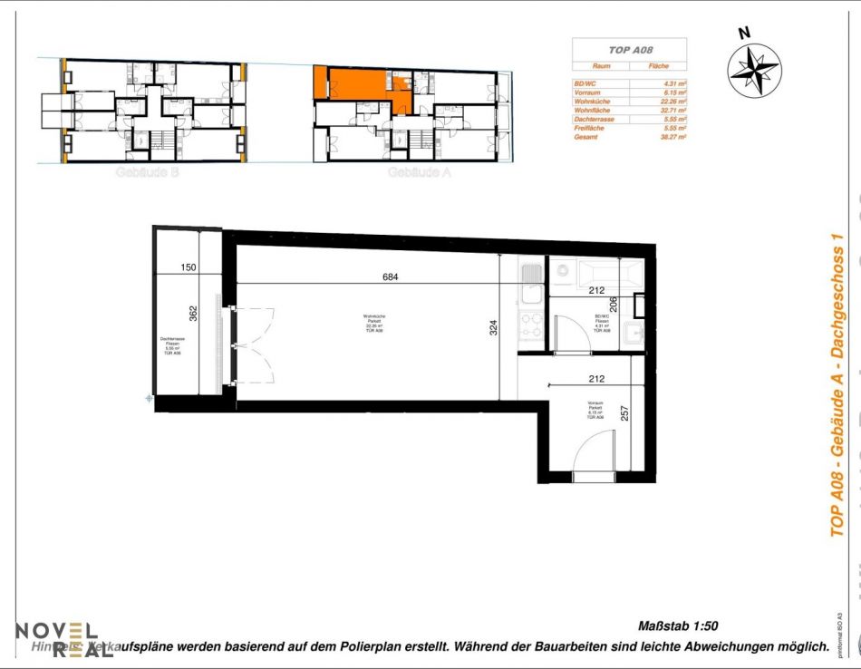 Diese Dachgeschoss-Wohnung überzeugt durch eine kompakte und zugleich funktionale Raumaufteilung. Der Vorraum bietet einen angenehmen Empfangsbereich mit Platz für Garderobe und Stauraum. Die Wohnküche ist offen gestaltet und schafft eine helle, einladende Atmosphäre für gemeinsames Kochen und Wohnen. Das Badezimmer mit WC ist modern ausgestattet und sorgt für Komfort im Alltag. Die Dachterrasse erweitert den Wohnraum ins Freie und bietet einen geschützten Platz zum Entspannen – ideal für ruhige Stunden oder den Start in den Tag.