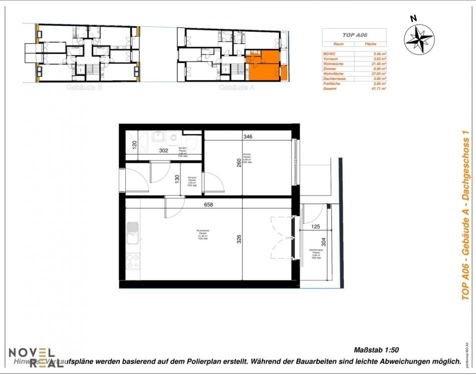 Diese Dachgeschoss-Wohnung überzeugt mit einer durchdachten Raumaufteilung und einem angenehmen Wohnambiente. Der einladende Vorraum bietet ausreichend Platz für Garderobe und Stauraum und führt direkt in die helle Wohnküche, die als zentraler Lebensbereich zum Kochen, Essen und Entspannen einlädt. Das angrenzende Zimmer lässt sich flexibel als Schlafzimmer, Büro oder Gästezimmer nutzen und bietet vielfältige Gestaltungsmöglichkeiten. Das Badezimmer mit WC ist modern ausgestattet und sorgt für Komfort im Alltag. Die Dachterrasse erweitert den Wohnraum ins Freie und bietet einen geschützten Platz zum Verweilen – ob für den Morgenkaffee oder entspannte Abendstunden.