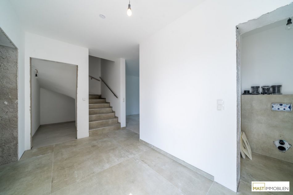Aktuell befindet sich das Haus in nahezu bezugsfertigem Zustand. Der Parkettboden kann von Käufer noch selbst ausgewählt werden, bevor die Fertigstellung komplett erfolgt.