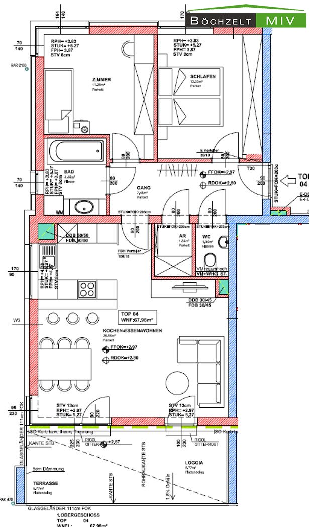 Die Wohnung hat eine Größe von ca. 74,97 m² und teilt sich wie folgt auf: Vorraum, Küche mit Wohn-/Essbereich und Ausgang auf den Balkon, zwei Schlafzimmer, Badezimmer mit Wanne und Fenster, separates WC und ein Abstellraum. Weiters sind der Wohnung ein Kellerabteil und ein Carportplatz zugeteilt.