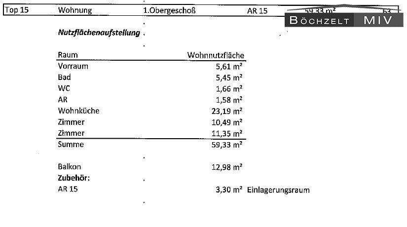 Der Kaufpreis für die Wohnung Top 15 beträgt € 189.900,–. In diesem Betrag sind der zugeordnete Carport‑Stellplatz sowie die Einbauküche bereits enthalten. Die monatlichen Betriebs- und Bewirtschaftungskosten betragen laut aktueller Information rund € 220,59. In diesem Betrag sind die Betriebskosten, Heizkosten, die Zuführung zur Rücklage sowie die Kosten für den Parkplatz bereits enthalten. Änderungen dieser Kosten sind im Rahmen der jährlichen Betriebskostenabrechnung möglich. Auf der Liegenschaft ist Wohnungseigentum begründet. Für die Wohnung Top 15 besteht Wohnungseigentum an der Wohneinheit inklusive des zugeordneten Carports und des Kellerersatzraumes. Innerhalb der Hausgemeinschaft ist derzeit die Überprüfung des Daches vorgesehen. Dabei sind insbesondere Nacharbeiten an den Flachdachhochzügen sowie die Reparatur der Attikaverblechung geplant. Die genaue Ausführung sowie die Kostenverteilung erfolgen nach Beschluss der Eigentümergemeinschaft und nach Vorgaben der Hausverwaltung. Der zur Wohnung gehörende Kellerersatzraum im Erdgeschoss weist eine Fläche von etwa 3,30 m² auf. Die Türe zu diesem Kellerersatzraum ist noch nicht hergestellt. Der Käufer hat diese Türe auf eigene Kosten zu errichten. Weitere Details zu Rücklagenstand, Protokollen der Eigentümerversammlung und technischen Unterlagen können bei weitergehendem Interesse gerne zur Verfügung gestellt werden.