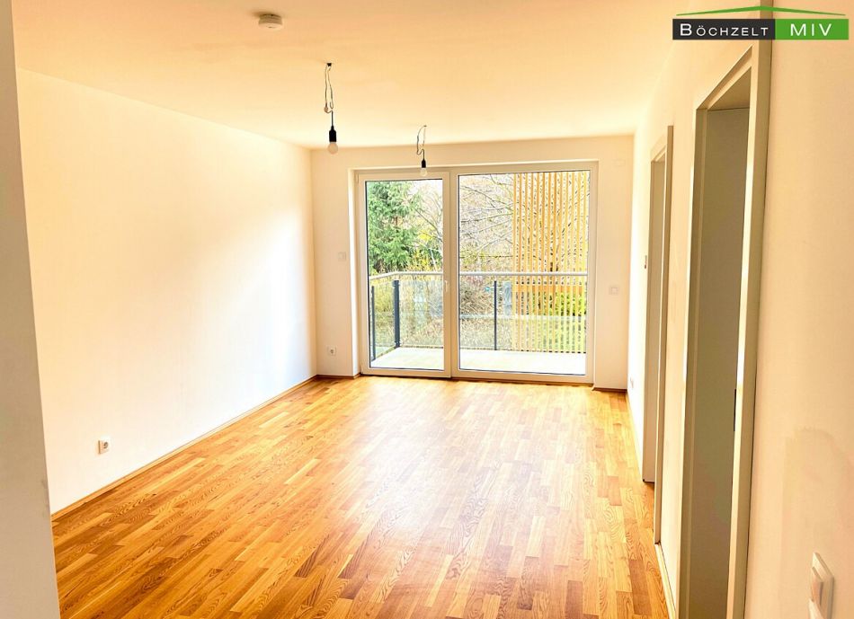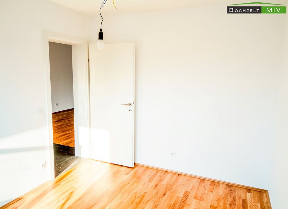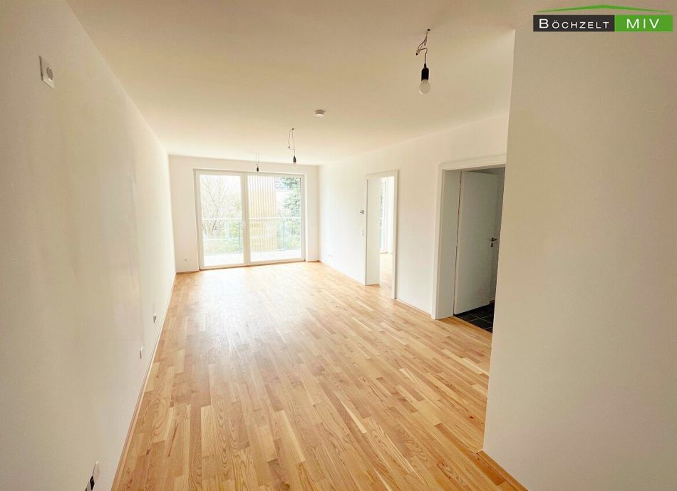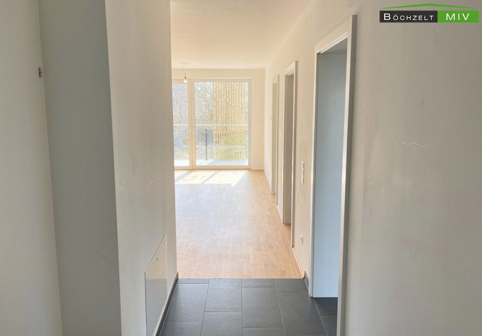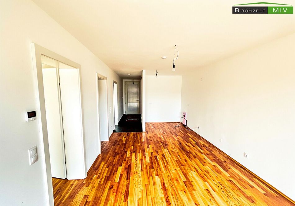 Die Wohnung liegt im 1. Obergeschoss der Wohnanlage. Der Zugang erfolgt über das zentrale Stiegenhaus oder bequem mit dem Lift. Vor der Wohnungstüre befinden sich der Laubengang und der Zugang zu den weiteren Einheiten. Beim Betreten der Wohnung gelangt man zunächst in den Vorraum mit einer Größe von etwa 5,61 m². Dieser Bereich bietet ausreichend Platz für eine Garderobe und Staumöbel und fungiert als zentrale Verteilerzone. Vom Vorraum aus erschließen sich sämtliche Räume der Wohnung. Der offene Wohn‑/Ess‑/Kochbereich verfügt über rund 23,19 m² und bildet das Zentrum des Wohnens. Große Fensterflächen sorgen für viel Tageslicht, und der direkte Ausgang auf den westseitigen Balkon schafft einen großzügigen Übergang zwischen Innen- und Außenbereich. Die moderne Einbauküche ist im Kaufpreis enthalten und fügt sich harmonisch in den Wohnbereich ein. Die Wohnung verfügt über zwei getrennt begehbare Zimmer. Ein Zimmer weist eine Fläche von etwa 10,49 m² auf und eignet sich sehr gut als Kinder-, Arbeits- oder Gästezimmer. Das zweite Zimmer umfasst rund 11,35 m² und ist ideal als Hauptschlafzimmer nutzbar. Beide Räume sind mit hochwertigem Parkettboden ausgestattet und bieten gute Stellmöglichkeiten für Möbel. Das Badezimmer hat eine Größe von etwa 5,45 m². Gemäß der Bau- und Ausstattungsbeschreibung ist es mit einer bodenebenen Dusche mit Ablaufrinne, einer Badewanne, einem Doppelwaschtisch sowie einem Waschmaschinenanschluss ausgestattet. Die Verfliesung erfolgt im gesamten Bad bis zu einer Höhe von rund 2,10 m. Das WC ist getrennt vom Badezimmer angeordnet und misst ungefähr 1,66 m². Es ist verfliest und mit einem Handwaschbecken ausgestattet, was den Wohnkomfort zusätzlich erhöht. Ein praktischer Abstellraum liegt direkt im Anschluss an den Wohnbereich und bietet mit etwa 1,58 m² zusätzliche Staufläche, etwa für Haushaltsgeräte oder Vorräte. Über den Wohn‑/Essbereich gelangt man auf den großzügigen westseitigen Balkon mit etwa 12,98 m². Dieser verfügt über einen Lichtauslass und eine Außensteckdose, sodass sich der Freiraum ideal für gemütliche Sitzgelegenheiten, Pflanzen und entspannte Stunden in der Abendsonne nutzen lässt.