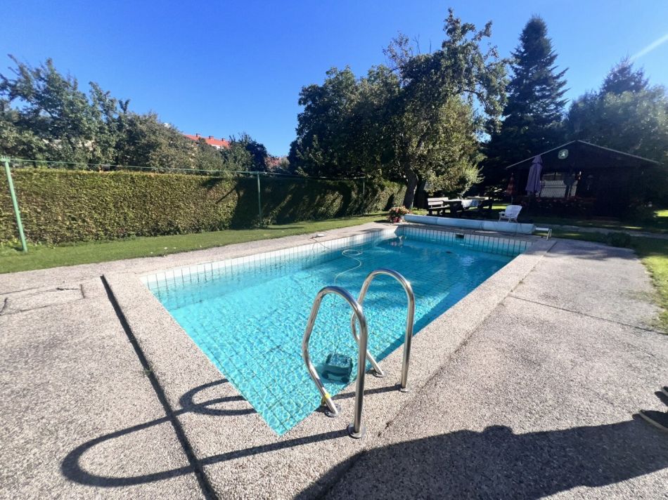 Das angrenzende Privathaus ist mit ca. 147 m² Wohnfläche im OG + 34 m² Keller- u. Lagerfläche im EG perfekt situiert. Der einladende Pool und die 2 Terrassen tun ihr übriges. Der äußerst großzügige Garten mit Gartenhütte wäre Ihr idealer Rückzugsort nach dem Geschäftsleben.