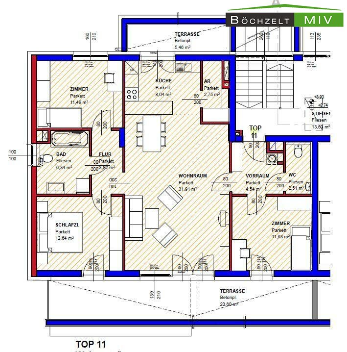Die Wohnung teilt sich wie folgt auf: Vorraum, Küche mit Wohn-/Essbereich, Schlafzimmer, 2 Kinderzimmer, Badezimmer mit Wanne & WC , separates WC, Abstellraum und 2 Balkone.
